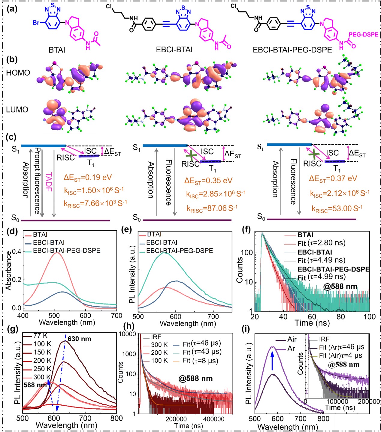 图1. 过共轭分子骨架同源性设计构建纳米材料,实现基于TADF的TRI引导PDT的示意图。(a) 具有BTAI核心(基于TADF的TRI探针)和EBCl-BTAI-PEG-DSPE外壳(暴露于氧气中的光敏剂)纳米颗粒的自组装过程。(b) 纳米颗粒用于TRI引导PDT的示意图。