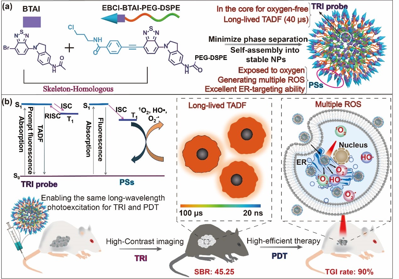 目前,尽管在分子层面上存在如热激发延迟荧光(TADF)或磷光等长寿命发光机制,并已被应用于TRI,但它们在TRI引导的PDT中的应用受到很大困扰,即三线态激子进行发光的辐射跃迁与产生活性氧(ROS)进行PDT之间存在很大的竞争关系。因此,利用有效且实用的TRI引导PDT仍然面临诸多挑战,比如:材料需具备高度生物相容性、高成像对比度以及高效的ROS生成和治疗效果等综合特性。