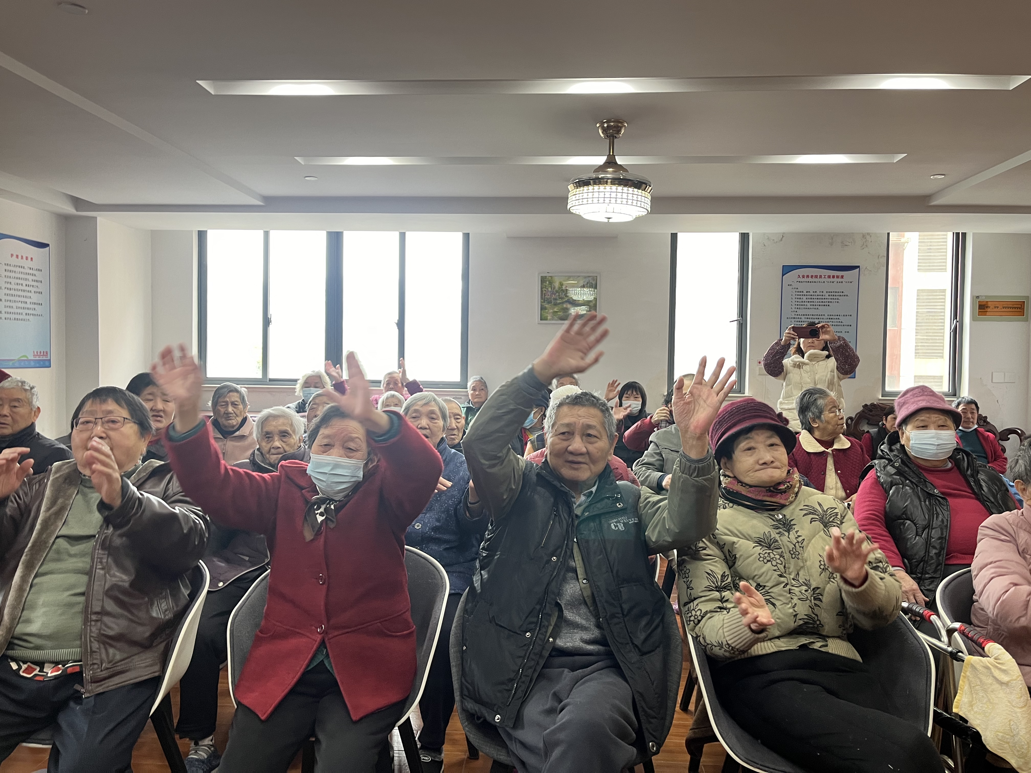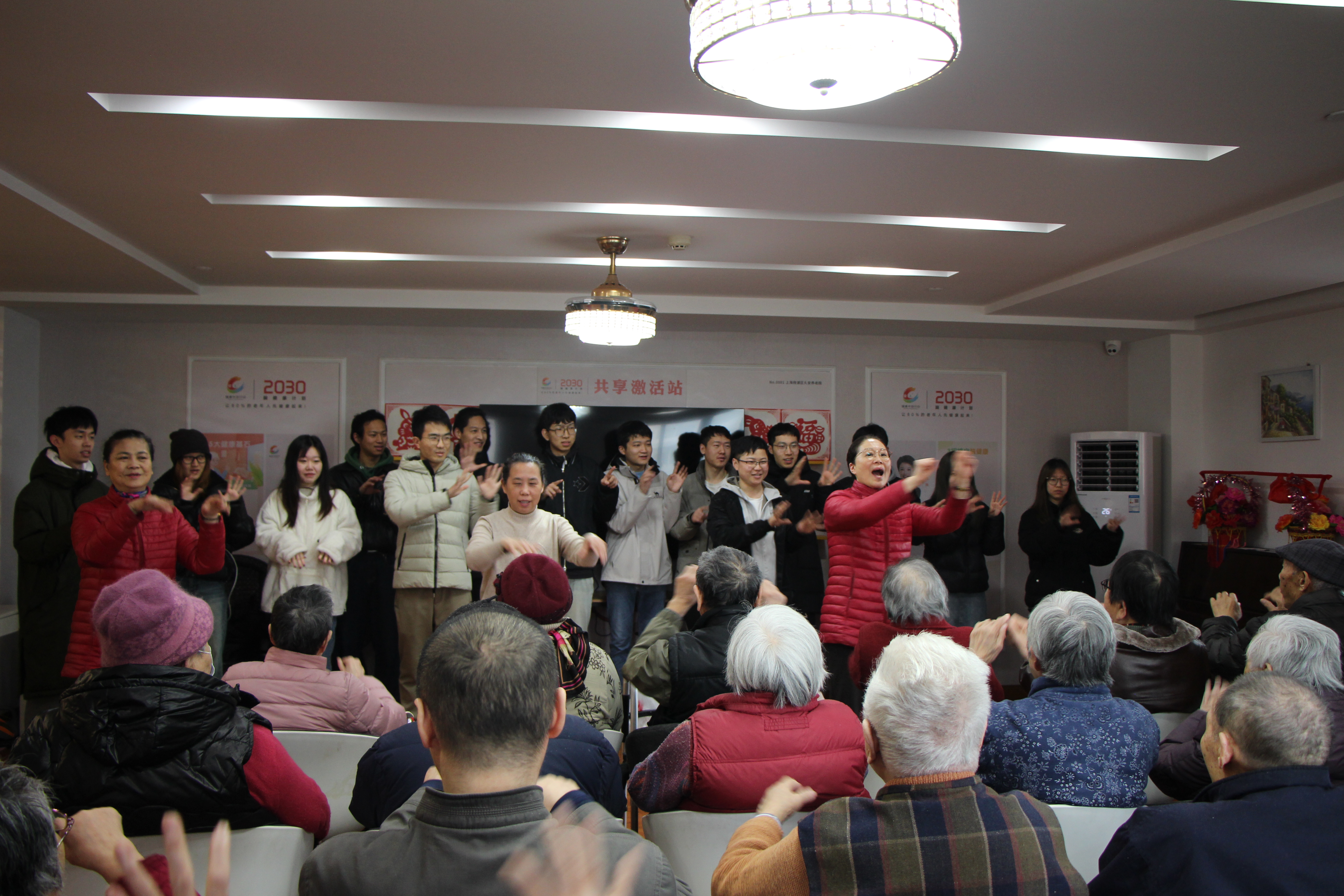 活动的第二个部分是锻炼表演。先是由志愿者们和护工阿姨耐心地为老人讲解手指操的动作要领,再带领爷爷奶奶们在参与中体会简单的手指操,既锻炼了身体,又活动了大脑。同学们与老人们的互动中,给爷爷奶奶带来了愉悦与放松。