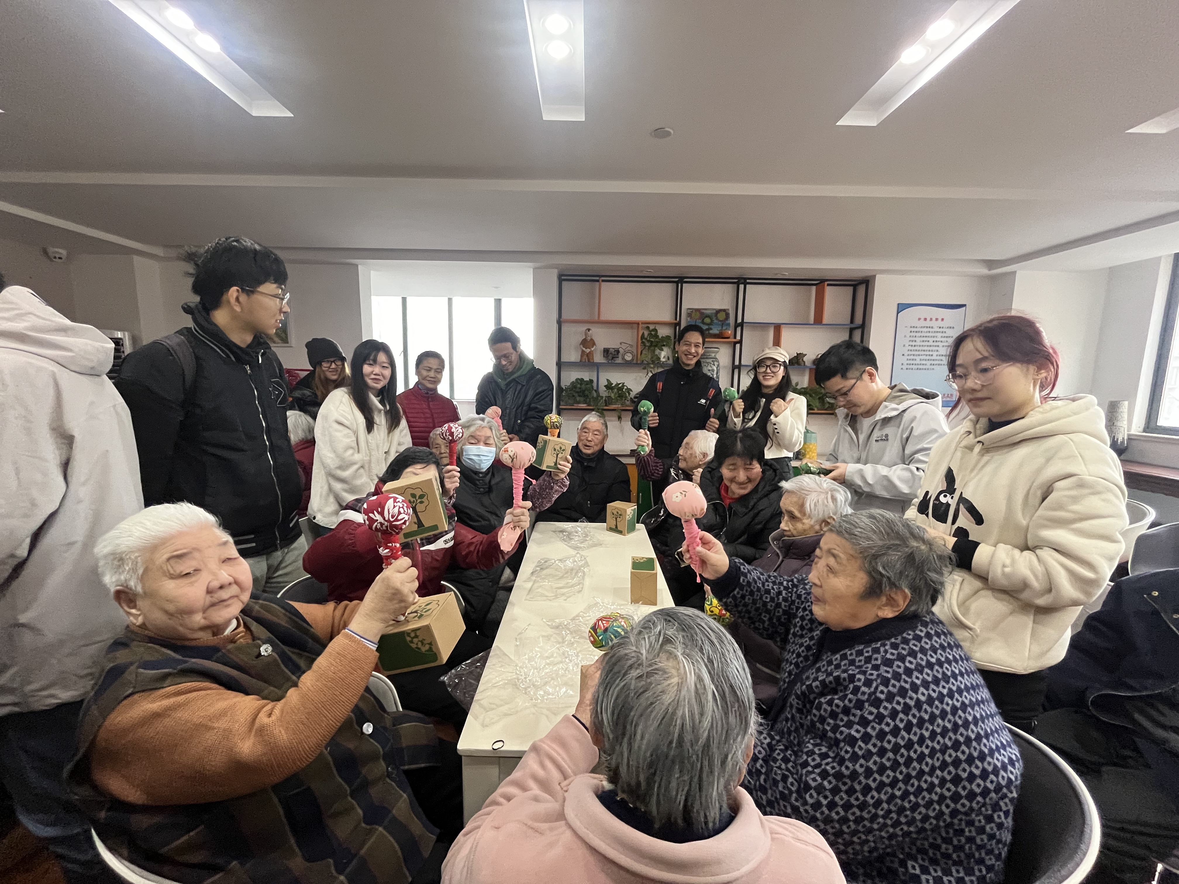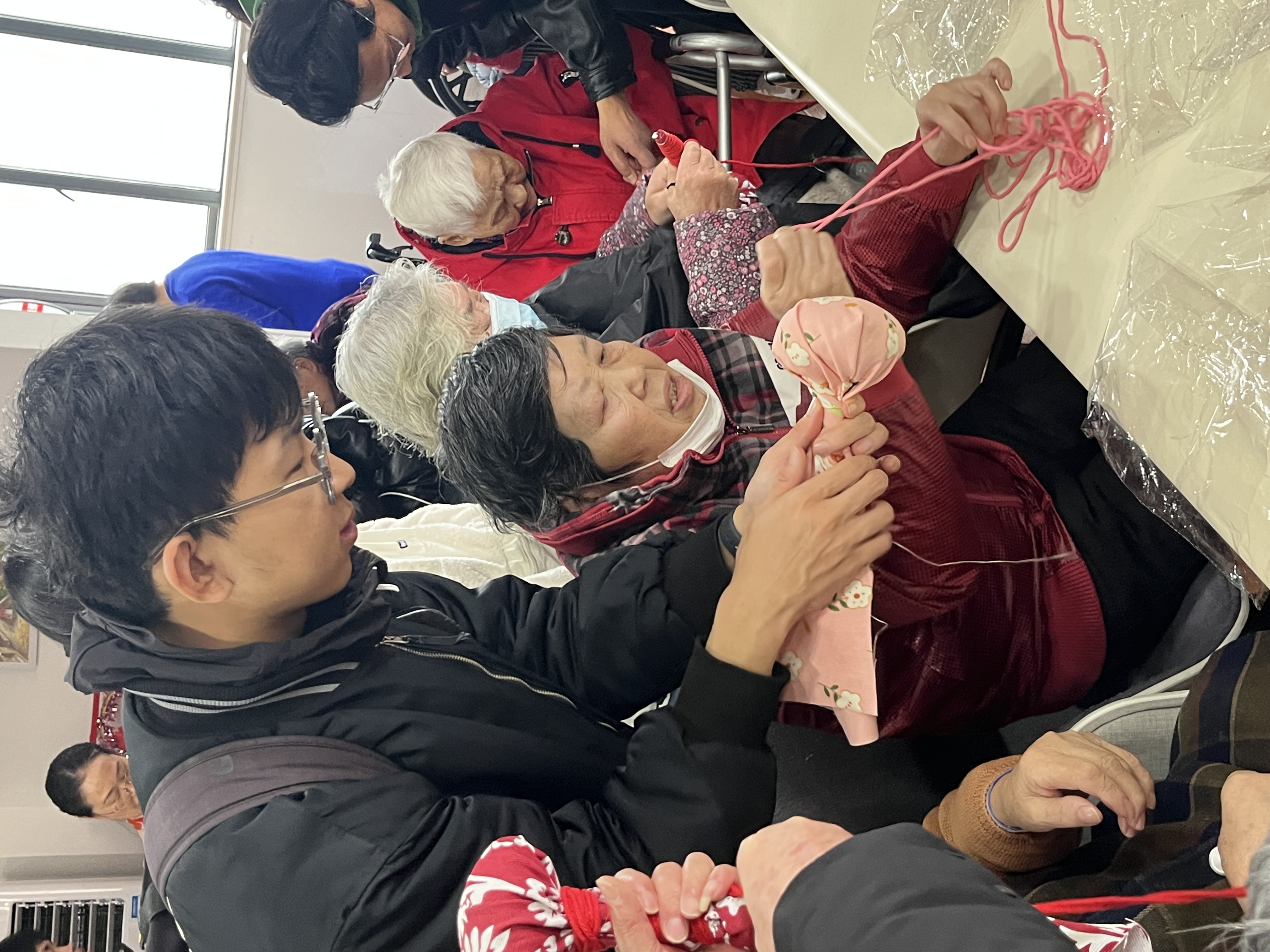活动进入第三个环节,由衣芳慧同学为老人们讲解“艾草锤”的制作步骤。爷爷奶奶在各位志愿者们的指导下,开始尝试制作手工“艾草锤”。老人们认真跟随讲解的步骤动手操作,与志愿者一起动手指,动脑筋,现场气氛活跃。在志愿者的帮助下“艾草锤”完成,老人们纷纷迫不及待地展示和使用了他们的作品,每个人的脸上都洋溢着幸福的笑容。同学们的陪伴给老人们生活送去了欢乐与温暖。