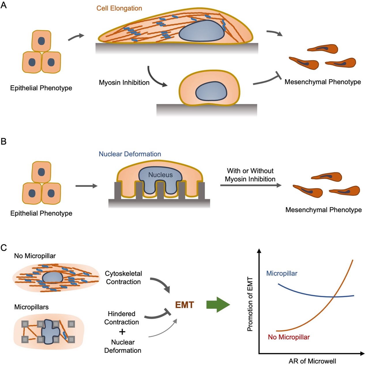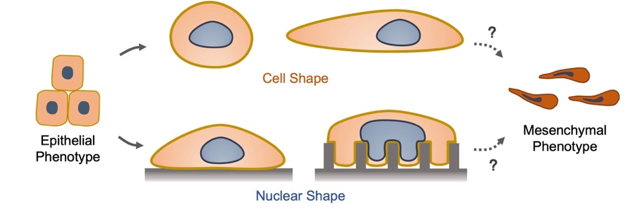 肿瘤转移是癌症致死的关键原因之一,上皮-间质转化(epithelial-mesenchymal transition, EMT)作为其中重要的细胞表型转化过程,受到来自肿瘤微环境和侵袭过程中几何限制的调节,与形态变化、力学响应密切相关。然而,由于缺乏精准、独立调节细胞与细胞核形状的方法,细胞与亚细胞结构的形态对于上皮-间质转化乃至其它细胞行为的影响通常难以区分。该研究旨在探讨细胞外形和细胞核形状各自对于EMT的影响,如图1所示。