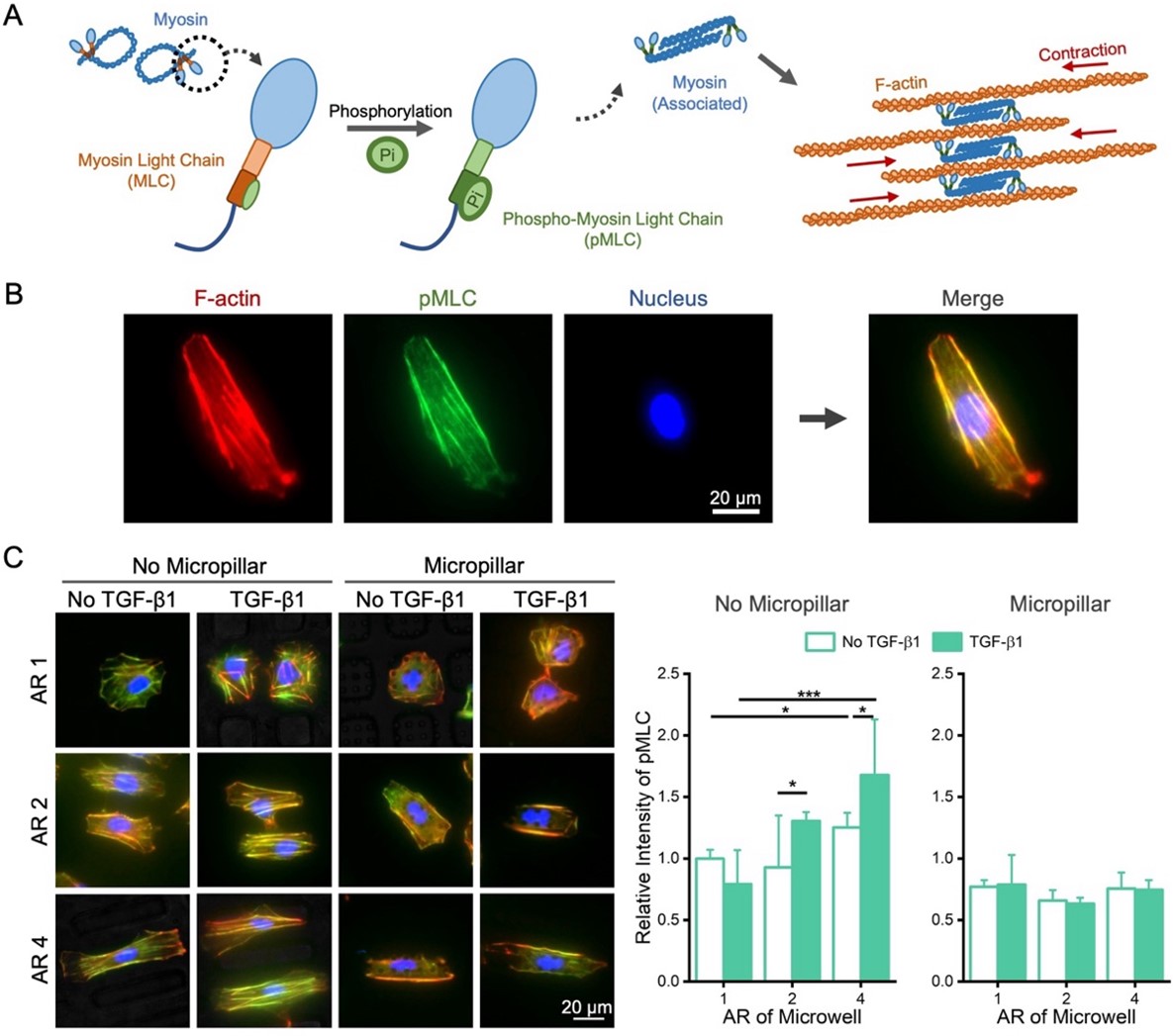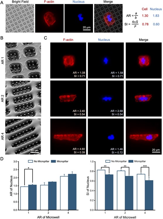 5. 微柱阵列阻碍了随长径比增加而激活的细胞骨架收缩性