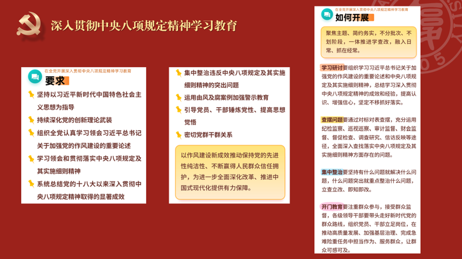 支部书记关新宇首先以《从八项规定看新时代全面从严治党》专题党课开篇,结合高校学生党员特点,重点剖析“改进调查研究”“厉行勤俭节约”等条款的现实映射,帮助学生党员理解“新时代全面从严治党以落实中央八项规定精神破题”,引导党员思考如何继承、发扬党的优良作风,进一步引发党员对形式主义、官僚主义苗头性问题的反思。