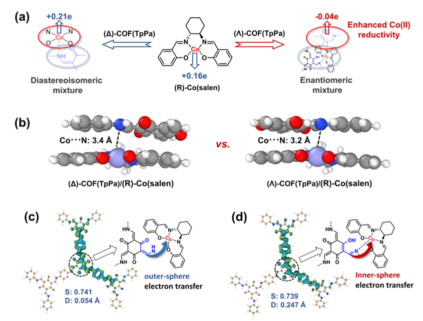 理论计算表明,手性对映选择表面固定通过双重机制优化催化性能:一方面,钴中心与COF的轴向配位通过配体-金属内球电子转移增强了钴中心的还原性;另一方面,金属诱导的连接键异构化促进了醇-亚胺局部区域的光生电荷分离,延长了光生电子寿命。尽管对映匹配与非对映匹配体系的能带结构相近,但前者凭借更高的载流子迁移速率和电子累积效率,实现了催化活性的突破。