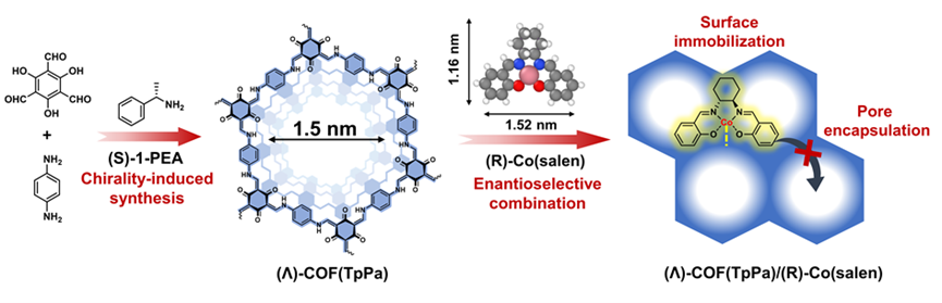 近期,复旦大学郭佳教授团队提出对映选择性表面固定策略,通过分子催化剂与COF的精准组装,实现了非贵金属光催化析氢体系的性能提升。研究团队设计了含环己烷手性中心的Salen四齿配体,与Co(II)配位合成手性Co(salen) 分子催化剂,并通过手性诱导法制备了具有构象手性的β-酮烯胺连接的微孔COF(TpPa)。利用手性对映匹配机制,将Co(salen)锚定至手性COF表面。由于COF(TpPa)微孔尺寸小于Co(salen)扩散尺寸,催化剂无法进入孔道,被迫负载于表面,而手性匹配作用进一步增强了两者的相互作用,形成高效稳定的单活性位点体系。