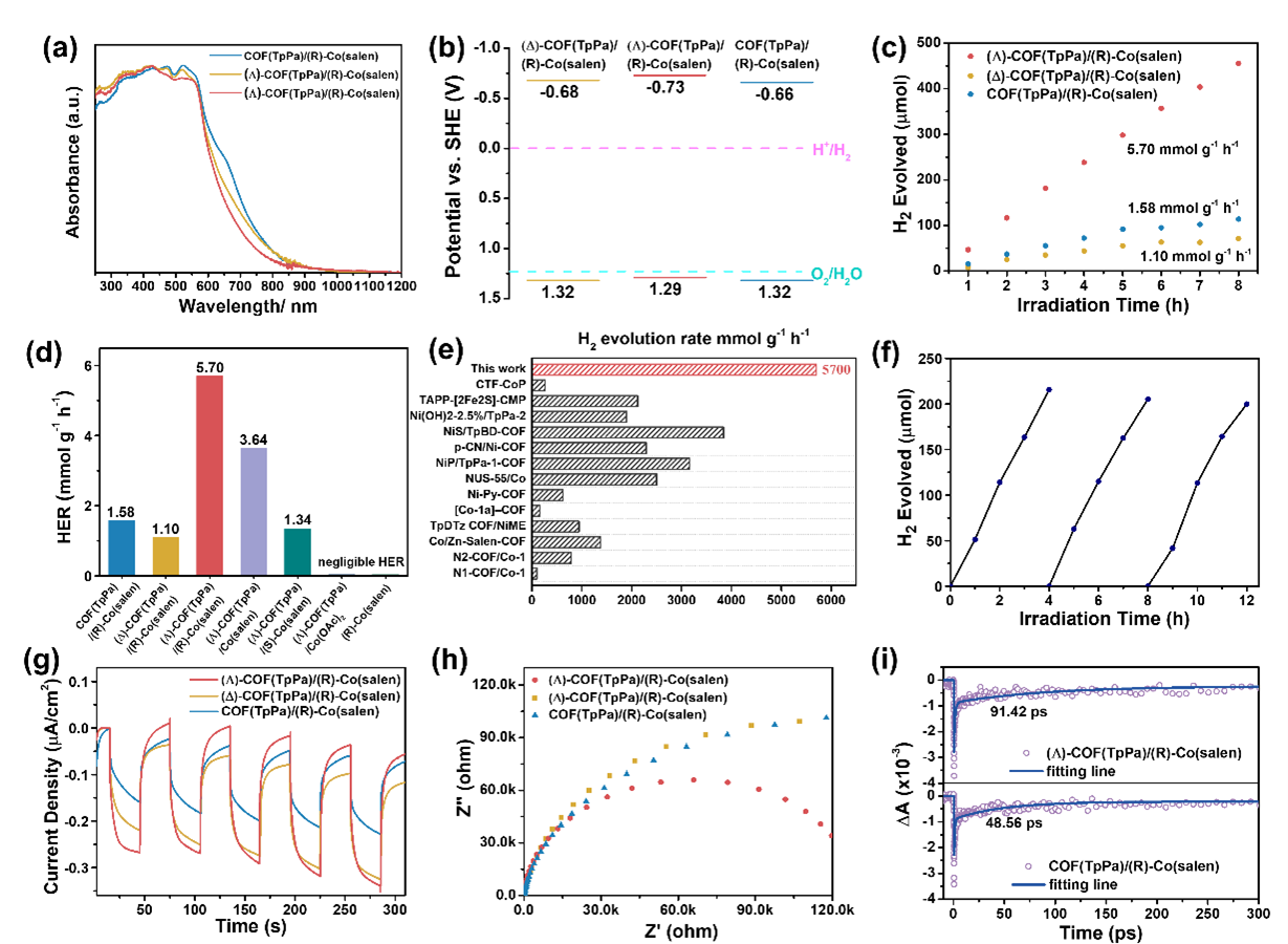 同步辐射分析表明,手性COFCo(salen)的组装诱导了酮-烯胺连接键向醇-亚胺结构的异构化。在组装体(Λ)-COF(TpPa)/(R)-Co(salen)中,异构化产生的亚胺NCo(II)中心形成轴向配位,不仅强化了催化剂与框架的结合力,提升了Co(II)的还原性,更构建了内球电子转移路径,相比外球机制显著提高电子转移效率。光催化产氢测试显示,该组装体的产氢速率达5.70 mmol g⁻¹ h⁻¹,超过非对映匹配体系及已报道的非贵金属有机光催化剂。