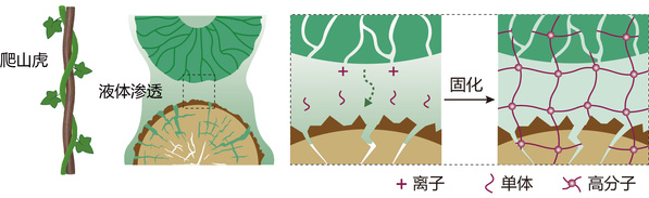突破的关键,源于对自然的观察与思考。某天,彭慧胜访问中国科学院上海硅酸盐研究所,注意到爬山虎可以紧密而稳定地缠绕在另一根植物藤蔓上。他细心察看,回去后查阅资料,了解爬山虎与被缠绕的植物藤蔓“如胶似漆”的秘密:爬山虎能分泌出一种具有良好浸润性的液体,渗透到两者接触表面的孔道结构中,使液体中的单体发生聚合反应,将爬山虎和被缠绕的植物藤蔓粘在一起。其中,孔道结构是实现重要生物功能的普适策略。