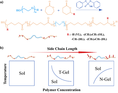 图1. (a) 一步合成含有不同烷基侧链的聚(ε-己内酯-co-5-烷基δ-内酯)-PEG-聚(ε-己内酯-co-5-烷基δ-内酯)三嵌段共聚物。(b)烷基侧链长度与聚合物宏观物理凝胶化行为之间的构效关系。