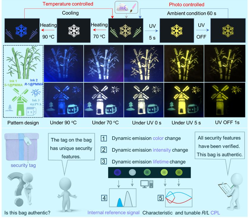 考虑到这种无定形单组份的薄膜材料体系具有丰富的光学信号集成和高度可控地多光学信号调节,作者探索了该材料在智能防伪中的应用,展现了优异地高安全性。