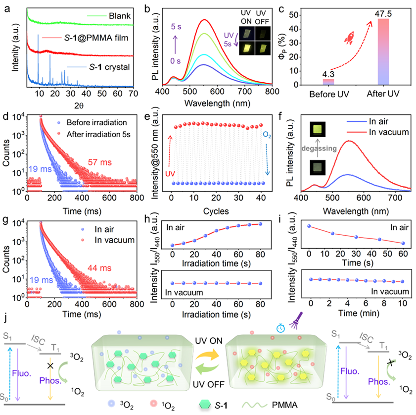 此外,通过简单地将发光团掺杂在聚合物薄膜中,制备了柔性透明的无定形薄膜体系。由于螺环多硫芳烃分子独特的分子结构,快速的系间窜越能力,合适的能隙以及刚性聚合物 对三重态激子猝灭地抑制作用,所制备的无定形薄膜体系同样表现出荧光-磷光双发射性质。由于磷光对外界环境地敏感性(三重激子对氧和温度敏感),该薄膜体系具备了特定的光和热刺激响应能力。
