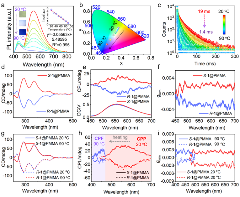 该无定形薄膜体系的发射颜色可以在光和热地刺激下,实现在黄色和蓝色之间(包括白光发射)可逆的原位调节。在调控过程中,相对稳定的荧光信号可以作为内在参考信号,可以提高整个系统发光颜色调控地相对准确度。该系统的最高光致发光量子效率在光激活后可达48% 以上。此外,该无定形单组分薄膜体系的圆偏振发光性质可以在温度地刺激下实习在圆偏振磷光和圆偏振荧光之间进行可逆切换。