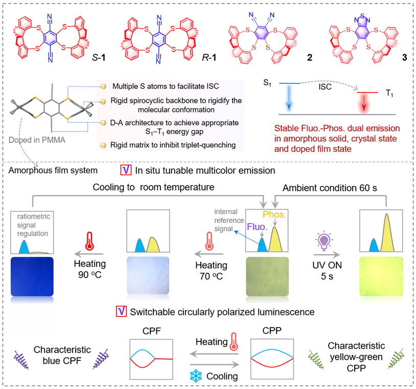 图1. 螺环多硫芳烃分子的结构和设计策略(上)。无定形单组份薄膜体系发光性质的调控示意图(下)。