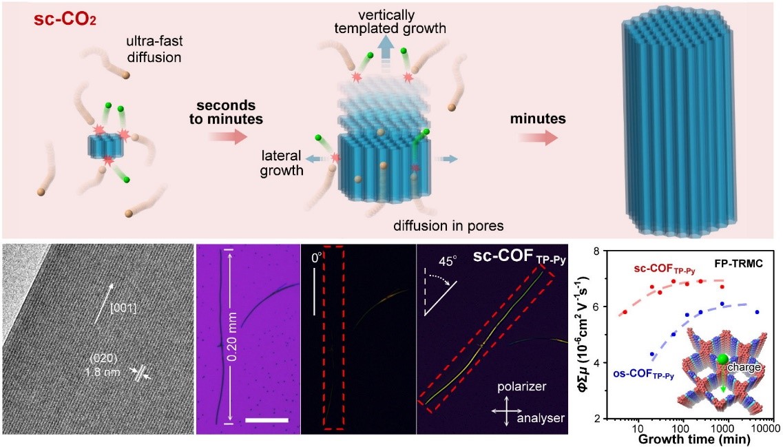 图:“超临界溶剂热法”机理以及COFs单晶的高分辨透射电镜、偏光显微镜和FP-TRMC表征