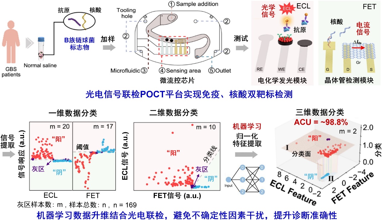 临床检测中,基于单一信号的POCTs会受到非特异性吸附、人为操作、随机干扰和传感器等诸多因素的影响,进而产生偶然的准确性和错误响应信号。因此,开发一种快速精准的检测方法以减少偶然准确性导致的误诊十分必要。2024年4月,魏大程课题组基于微流控技术和机器学习算法开发了光电联合多分类诊断平台。在501例临床样本检测中,该平台实现了~98.8%的准确率检测。