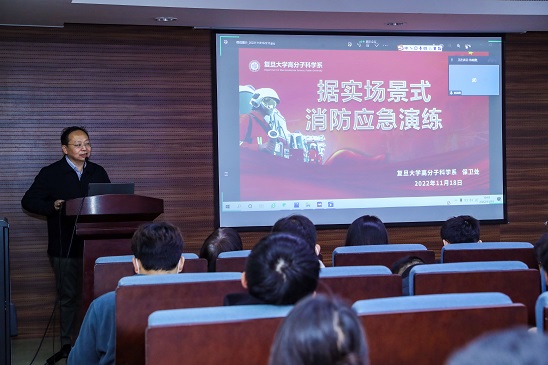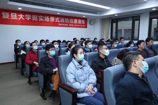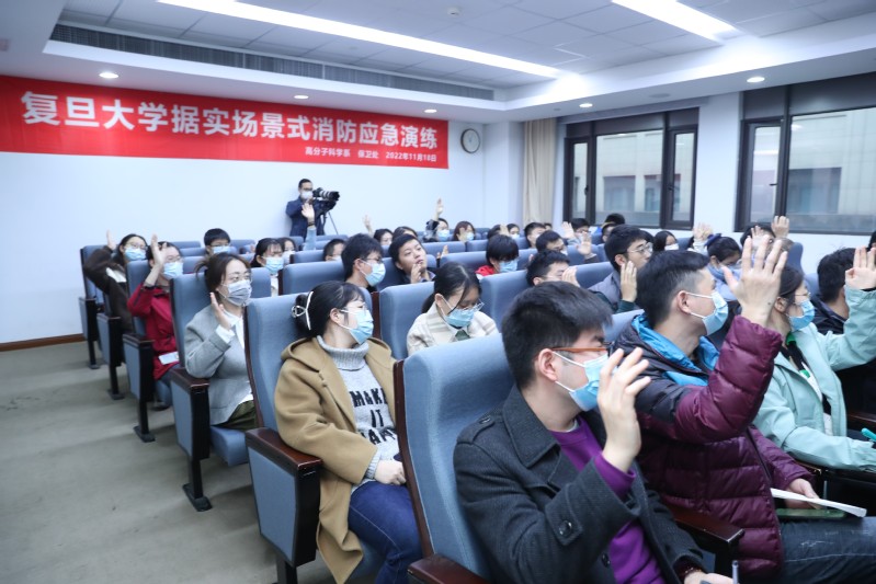 在点评专家的引导下,学生们从视频中积极查找本次演练中实验室现场同学的应急处置方法的不足之处(图21),参加演练的志愿者也分享了关于所采取的应急处置方法的思考(图22)。这次复盘活动持续了一个半小时,点评专家认为:复旦高分子系的演练志愿者们对于两个演练场景的应急处置方式是适当的,表明高分子系开设的《实验室安全知识与实践》课程达到了培训同学们掌握正确的应急处置方法的目的;复旦大学保卫处的应急相应速度快,事故现场处置方法规范、有效,应急疏散方案有效可行;院系与校保卫处的应急响应系统衔接有效;高分子上报事故的流程规范;在规定的时间楼内人员均撤出大楼,未发现有人员在紧急情况下乘用电梯疏散、或者躲入厕所内的现象,高分子系的应急疏散训练有素。