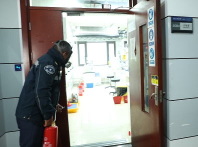 图13. 全楼人员撤离现场,安保人员拿灭火器赶赴事故现场 图14. 校保卫处安保人员到事故现场处理事故,确认事故现场安全