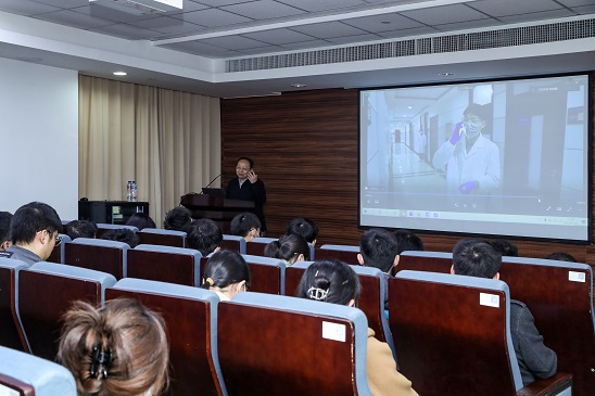 在准备演练结果复盘视频处理的间隙,Bet365中文网址 邀请保卫处孙超老师进行了一场《消防安全》讲座(图17)。孙老师讲解了消防安全知识,并结合现实火灾案例、消防法规等重点讲解了火灾产生原因、如何灭火、如何自救逃生等消防知识,播放了结合戏剧科普灭火器、消防栓使用的视频等。孙老师的讲座采用妙趣生动的语言讲解枯燥的消防安全知识,牢牢吸引住线下师生们的注意力(图18),师生们在会心一笑中也牢牢记住灭火器的使用口诀“提、拔、握、压”和消防栓的“开、按、接、转”使用口诀(图18)。此次消防安全报告采用线下线上结合的方式,听讲座的师生逾500人。