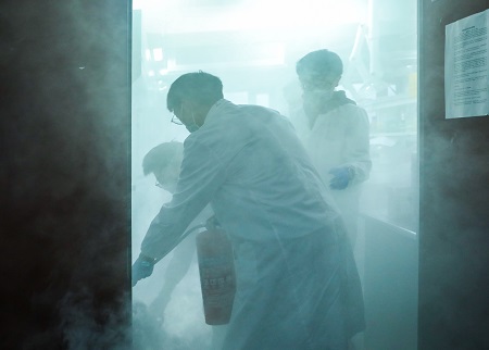 9时半开始,进入应急演练模拟的第二个场景:B5084实验室在进行实验中,周边冰箱突发火情(存放叔丁基异氰酸酯、炔丙基溴溶液、对甲氧基苄氯等)。为了增加应急处置难度,演练策划组特意将装有有机废液的垃圾桶移至发生火情的冰箱旁边,以检验同学们的应急处置能力。