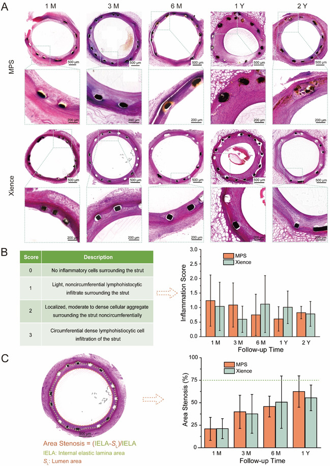 (A)植入MPS支架和Xience支架的猪冠状动脉的HE染色照片;(B)通过HE染色照片半定量评估炎症反应的标准(左)和统计结果(右);(C)计算面积狭窄率的示意图(左)和定量统计结果(右)。