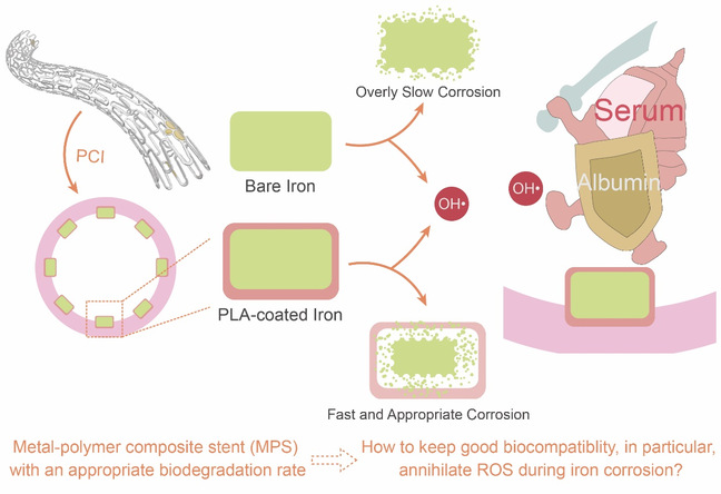 生物可降解支架由于有望解决永久支架的慢性炎症和晚期管腔丢失等问题而成为下一代介入治疗器械的重点之一。左旋聚乳酸、镁合金和铁合金等是主要的候选材料,其中铁基材料具有最佳的力学强度等优势,但其过慢的降解速率成为瓶颈。目前生物可降解支架的研究瓶颈集中在两方面,一是如何获得合适的降解速率,而是降解所带来的生物相容性的担忧。该工作提出了金属-高分子复合策略,在铁基骨架外围引入聚乳酸(PLA)涂层,使得铁基冠脉支架降解速率与血管重塑过程相匹配,如图1所示。此外,该工作还研究了血清在清除铁基材料降解产生的活性氧、消减氧化损伤的作用,并通过大动物实验和人体临床试验证明了该金属-高分子复合支架的安全性与有效性。