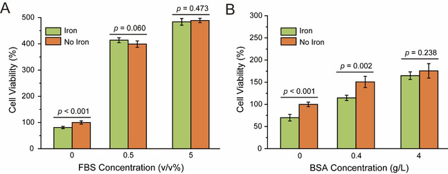 为了探究血清对铁腐蚀氧化损伤的作用,丁建东课题组将人脐静脉内皮细胞(HUVEC)在含有0.8g/L羰基铁粉和不同浓度胎牛血清(FBS)的DMEM培养基中培养,以不含羰基铁粉的对应组别作为对照,并通过CCK-8试剂盒表征细胞活力。从图3A中可以看出,仅加入0.5%的FBS,羰基铁粉就对细胞活力不再有影响,表明血清能消减铁腐蚀对细胞的氧化损伤。而图3B的结果则说明血清中的白蛋白在消减氧化损伤中发挥了重要作用。研究还表明,血清和白蛋白的作用主要是通过清除腐蚀过程中产生的羟基自由基而实现。