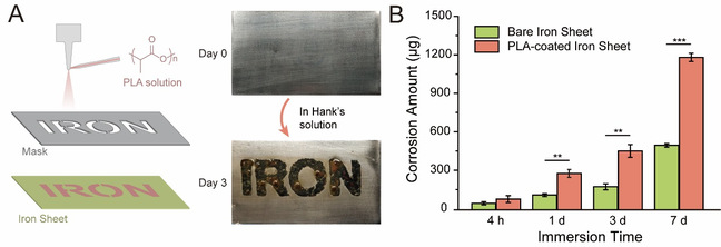 (A)在铁片表面制备“IRON”图案PLA涂层的示意图和浸泡前后照片;(B)裸铁和PLA涂层铁片在Hank’s液中浸泡不同时间的铁腐蚀量。