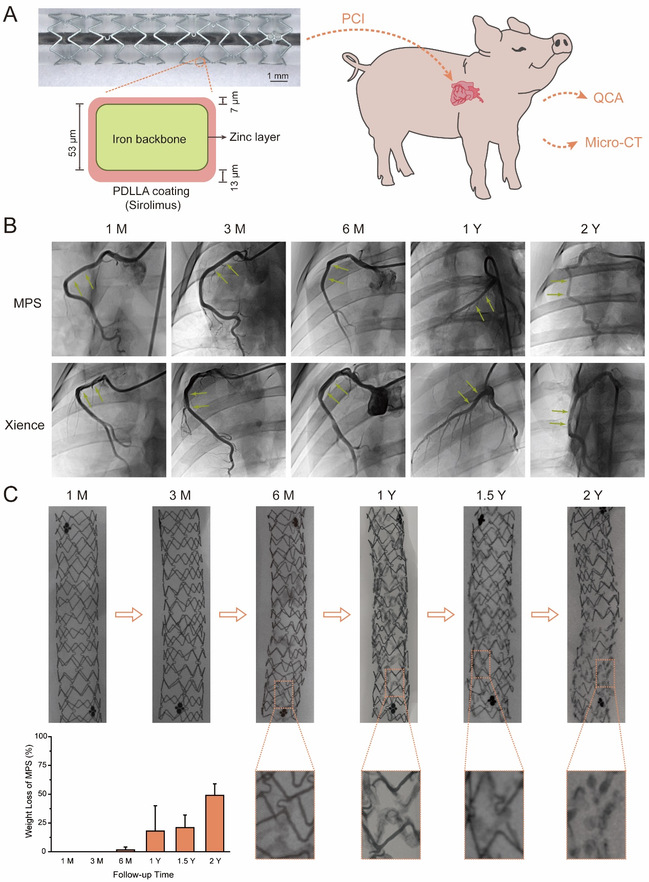 (A)MPS支架设计和植入示意图;(B)MPS和Xience植入后的冠脉造影图像;(C)植入MPS血管段的micro-CT图像。