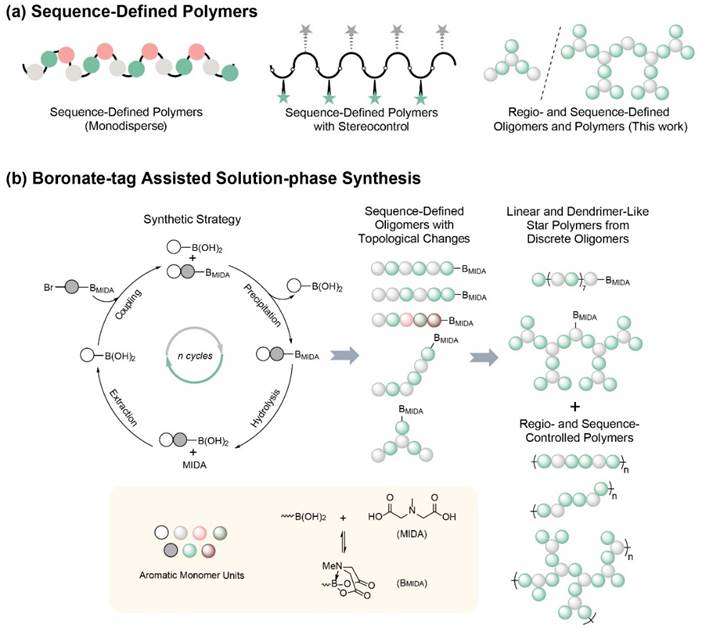 图1.(a)序列定义聚合物;(b)硼酸酯辅助的液相合成。
