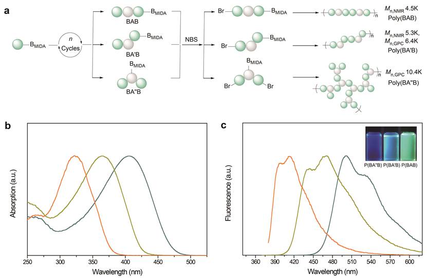 这些合成的区域和序列定义的低聚物可以通过迭代指数增长和缩聚反应,制备出区域和序列可控的拓扑聚合物,如线形、支化和树枝状等。作者还讨论了对位或者间位连接、拓扑结构和序列对共轭聚合物性能的影响。如图3所示,聚合物poly(BAB)、poly(BA'B)和poly(BA''B)具有类似的分子量和不同的拓扑结构,在紫外光的照射下能够发出不同颜色的荧光。因此作者发现拓扑结构对共轭聚合物的光学性质具有显著的影响,这为调控共轭聚合物的性能提供了途径,期望这种合成方法能够制备出具有不同应用领域的功能材料,如数据存储、有机电子等。