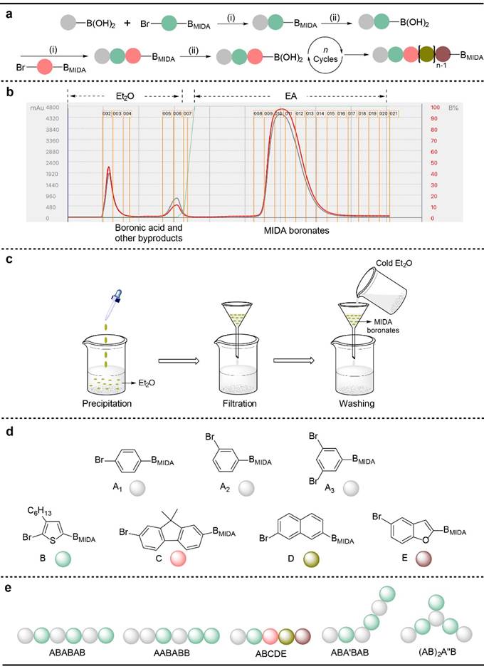 通过迭代合成策略,作者精确控制了低聚物的长度、序列和拓扑结构。低聚物的合成是从硼酸和含有MIDA硼酸酯的芳基溴之间的Suzuki-Miyaura偶联反应(步骤i)开始,然后MIDA硼酸酯经过水解反应(步骤ii)继续释放硼酸基团,这两个反应构成了液相迭代合成中的反应循环(图2a)。在自动过柱机的分离步骤中,通过将洗脱剂由乙醚(Et2O)换成乙酸乙酯(EA),很容易实现MIDA硼酸酯产物的纯化和分离。首先是用乙醚作为洗脱剂去除多余的硼酸反应物和副产物,然后用EA作为洗脱剂得到高纯度的MIDA硼酸酯产物(图2b)。MIDA硼酸酯产物也可通过沉淀和洗涤来进行纯化。将反应混合物滴入到过量的Et2O中进行沉淀,然后用冰冻后的Et2O来洗涤得到MIDA硼酸酯产物(图2c)。在迭代合成中,引入不同类型单体可以制备出多种区域和序列定义的共轭低聚物(图2d和2e)。