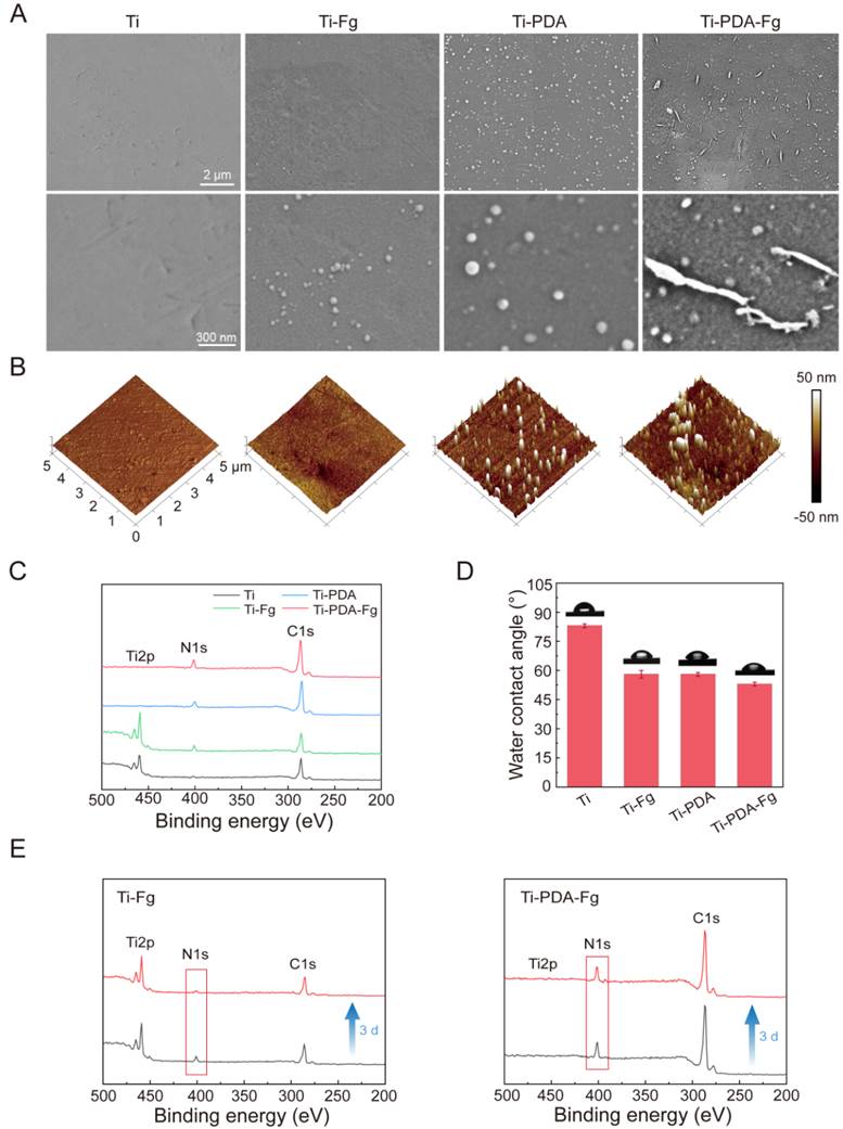 将Ti-6Al-4V 钛合金根据图 1所示的改性技术利用纤维蛋白原生物大分子进行改性后,采用FE-SEM、AFM、XPS和WCA等技术对改性前后的钛合金表面进行表征(图2)。为了考察蛋白涂层的稳定性,利用XPS和静态水接触角(WCA)对两种蛋白样品(Ti-Fg、TI-PDA-Fg)表面进行了表征,实验结果表明聚多巴胺介导的纤维蛋白原涂层比物理吸附纤的维蛋白原涂层更加稳定。