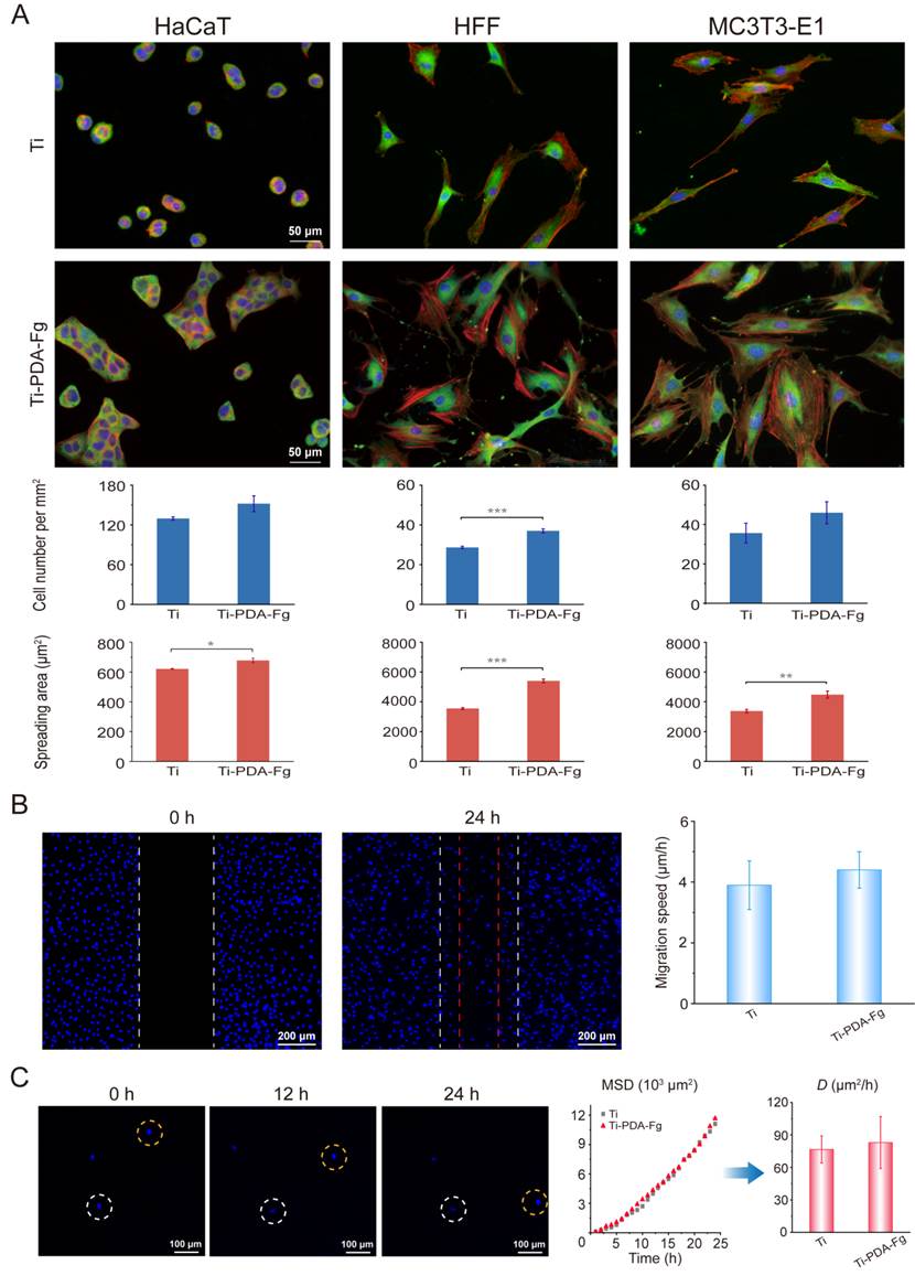 项目组还研究了与经皮器械密切相关的三种细胞类型在改性表面上的黏附和/或迁移行为,以验证纤维蛋白原修饰的有效性,分别是表皮细胞 (HaCaT)、成纤维细胞 (HFF) 和前成骨细胞 (MC3T3-E1) 。结果表明多巴胺辅助的纤维蛋白原改性增强了所有三种类型细胞的粘附(图3)。