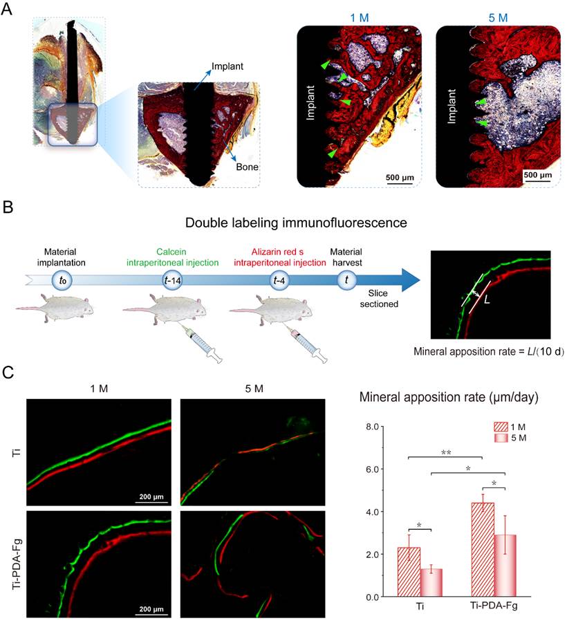 项目组还运用了VG染色和荧光双标技术对新骨的矿物沉积速率进行了半定量统计(图5)。结果表明多巴胺结合纤维蛋白原修饰的钛合金可以显著促进新骨生成。