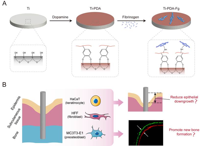 这项基础研究对生物大分子修饰的金属与软、硬组织的生物密封和骨整合进行了系统的研究,研究表明通过聚多巴胺预涂层共价固定纤维蛋白原有望增强金属植入物与软、硬组织的生物密封和骨整合,这对于骨科经皮医疗器械至关重要。研究结果还进一步说明了在聚多巴胺的辅助下使用纤维蛋白原的表面修饰技术是实现成功经皮植入的有前途的策略。