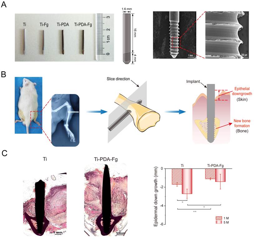 为了研究纤维蛋白原涂层对于抑制上皮下行的作用,项目组设计并制造了底部带有螺纹的 Ti-6Al-4V 螺钉,目的在于实现植入前期的牢固的骨固定,然后将其经皮植入 SD 大鼠的胫骨中。结果表明,纤维蛋白原共价功能化修饰的钛植入物可以有效地减少上皮的向下生长(图4)。