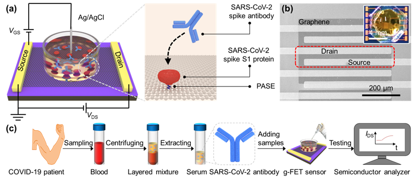 研究发现,将新冠病毒刺突蛋白通过化学方法修饰在石墨烯传感界面,石墨烯场效应晶体管(g-FET)能有效地将新冠抗体与刺突蛋白的特异性结合转变成沟道电导的变化,进而实现对新冠抗体的超灵敏检测,检测限低至2.6 aM(1 aM = 10−18 M),相当于100 μL血清中大约150个抗体分子的浓度。经临床血清样品验证,该g-FET能准确分辨出阳性和阴性新冠患者,最快诊断时间低至2分钟。检测结果可直接从电学响应中读出,不需要复杂的操作或数据处理。这种检测芯片通过半导体加工工艺制造,成本相对较低,方便集成到便携式系统中,为现场和即时检测新冠病毒提供了很大的希望,使人们能够在海关、车站、诊所、家中甚至互联网上监测感染状况,减少交叉感染的风险。