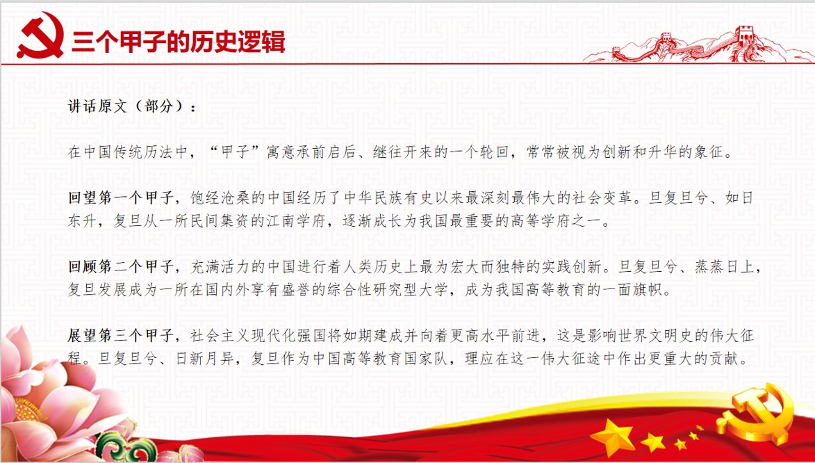 研究生第三党支部支部书记郑浩同志带领支部同志开展理论学习,他提到“创新是复旦与生俱来的基因”、“创新型大学要为人的创造性发展提供无限可能”等内容,接着带领大家线上集体观看了复旦大学120周年校庆金力校长讲话,学习讲话中“三个甲子的历史逻辑”、“创新基因的文化内核”、“创新型大学的实践要求”三大核心要点,并结合校史馆线上资源,简要梳理讲话中“历史-现实-未来”的逻辑主线,强调“创新是贯穿双甲子的不变主题”。随后,支部宣传委员欧凯琴同志总结了如“创新是复旦与生俱来的基因”“创新型大学要为人的创造性发展提供无限可能”“突破边界需要改革的勇气”等相关金句,分享给全体支部党员共同学习。