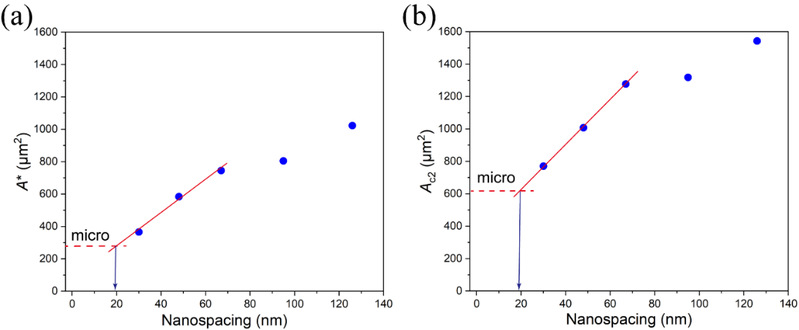 该基础研究的意义不限于针对图案化表面的细胞行为。人们早就认为,在非图案化自由表面上RGD配体的最小有效纳米间距并不是0,但是尚无任何研究可以确认这个数值,因为直接在非图案化表面或者单纯的微米/纳米图案化表面难以开展相关研究。复旦大学丁建东课题组借助其独到的微纳米杂合图案以及对临界细胞黏附面积的考察,通过对一系列RGD纳米间距计算出的细胞临界黏附面积进行渐进分析,首次获得了这个数值。第一临界黏附面积A*(细胞在黏附岛上从无到有)和第二临界黏附面积AC2(随黏附岛面积的增大细胞在黏附岛上从一个变为两个)的计算可以得到几乎一致的配体最小有效纳米间距,约为19 nm(图5)。