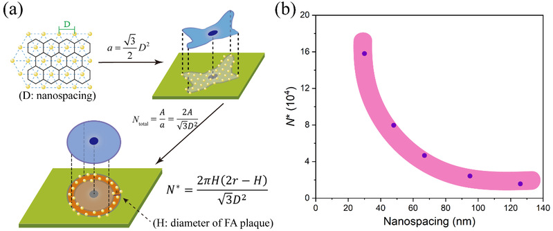 图6 (a)整合素与细胞配体结合的临界数量(N*)的推导过程示意图;(b)根据实验结果,得到的N*与纳米间距的曲线。