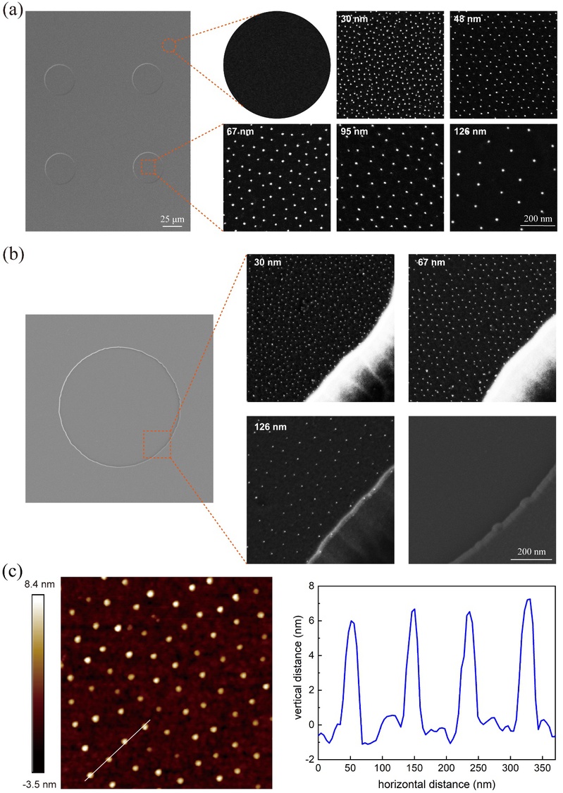 图3 微纳米图案化材料表面形貌表征结果:场发射扫描电子显微镜对一系列微纳米岛内部金纳米阵列(a)和微米岛边缘(b)的表征;(c)典型的金纳米阵列的原子力显微镜表征结果。