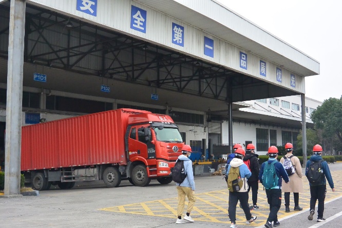 参观完实验室后,同学们带上安全帽分批进入金发科技车间生产线,了解实际的生产工艺流程。在讲解人季洪兵的带领下,同学们近距离参观了解了投料、计量、挤出、冷却、切粒等生产全过程。