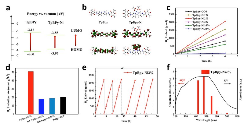 DFT理论模拟计算进一步说明了受到COF堆叠结构的影响,扭转的顺式2,2'-联吡啶配体在堆叠模型内旋转到完全平面结构的能垒明显较大,因此在温和反应条件下只能形成扭曲的弱配位结构,其中Ni-N键长被略微拉伸,并且相邻的联吡啶单元配位也受到了空间位阻的限制。在溶剂热的高温条件下,层状2D COF被充分溶剂化,削弱了层间作用力,有利于框架上的2,2’-联吡啶调整构象,与Ni(II)络合形成稳定的平面四配位结构,从而促进了金属到配体的电荷转移(metal-to-ligand charge transfer, MLCT)效应,提高了光生电子空穴的分离与转移。