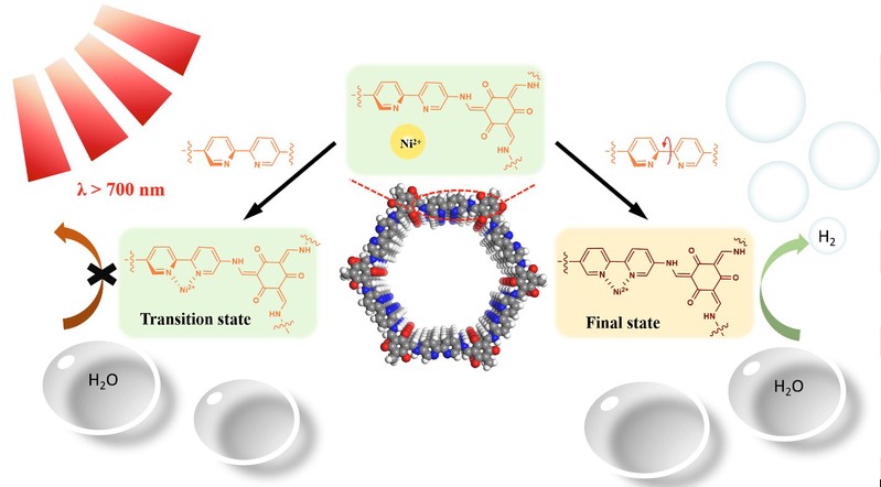 近日,复旦大学郭佳教授团队以含有络合配体2,2'-联吡啶单元的酮-烯胺键连接COF(TpBpy-COF)为研究对象,通过溶剂热法解锁COF的紧密堆积结构,使吡啶之间的碳碳单键旋转并与镍(II)离子稳定络合,制备得到了全色可见光响应的光催化剂。
