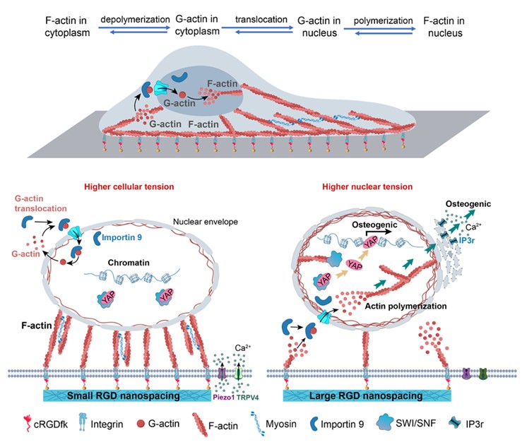 Cell-material interactions are critical for advanced biomaterials and regenerative medicine. According to the classic viewpoint, stable cell adhesion leads to higher cytoskeletal tension and thus promotes osteogenic differentiation of mesenchymal stem cells (MSCs). Its universality was, however, challenged by Prof. Jiandong Ding at Fudan University, for his team observed an anomalous phenomenon based on well-controlled nanopatterns of cell-adhesive arginine-glycine-aspartic acid (RGD) on nonfouling polymeric hydrogels. They found that large RGD spacings hindered cell adhesion yet sometimes promoted osteogenic differentiation of MSCs. This unexpected phenomenon prompted extensive research to explore how nanoscopic surface signals are transduced into the cells and regulate stem cell differentiation, eventually leading to the identification of a biomechanics-related signaling pathway. They demonstrated that nuclear translocation of actins and their polymerization into filamentous structures in cellular nucleus, increasing nuclear tension, play a pivotal role in activating osteogenic genes.