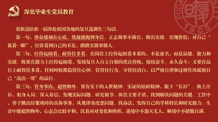 一名党员就是一面旗帜,毕业生党员们要始终不忘初心,牢记使命,无论毕业后去往何处,都要在未来的人生道路中时刻铭记党员身份,在实干中练就真本领,努力在青春的赛道上跑出当代青年的最好成绩,充分发挥党员的先锋榜样和战斗堡垒作用,为中国式现代化建设挺膺担当,为国家和民族奉献自己的一份力量!