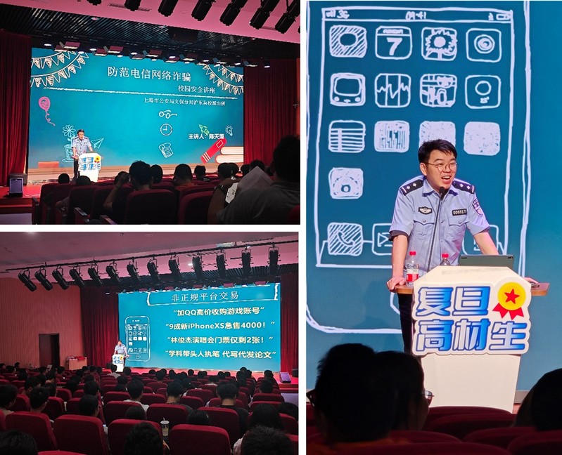 9月3日下午,上海市公安局文保分局沪东高校派出所陈天箫警官为2023级本科生和2024级研究生新生进行了防诈骗安全教育。陈警官从校园电信网络诈骗受害人群及类型出发,用统计的方式为同学们展示了近年来校园内电信诈骗案件数量变化,并详细介绍了冒充公检法、冒充熟人诈骗、冒充客服诈骗、非正规平台交易、杀猪盘、视频裸聊诈骗等常见电信诈骗类型,提醒大家绷紧防范之弦,增强识骗、防骗、拒骗的能力,远离诈骗之害。陈警官用诙谐的语言、生动的案例给同学们提出警醒,希望各位同学树立起“防患于心,反诈于行”的观念,从思想上提高警惕,在行动中积极落实,远离各类诈骗陷阱,保护好自身安全。