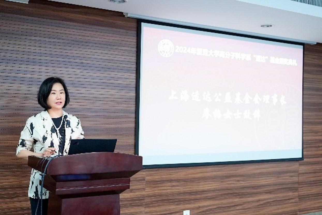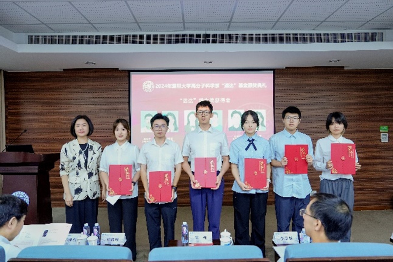 上海适达公益基金会理事长廖梅女士为获得“适达”学生奖的朱泓宇、谢绮萱、吴官玲、杨子俊、洪凯楠和赵春晖颁奖。赵春晖作为获奖学生代表发言。她表示,科研之路并非坦途,需要扎实的专业知识、敏锐的洞察力、坚忍不拔的毅力和勇于创新的精神,未来会不断提升自己,以更加饱满的热情和更加坚定的信念投身于高分子科学的研究之中,努力成为高分子领域的优秀工作者。