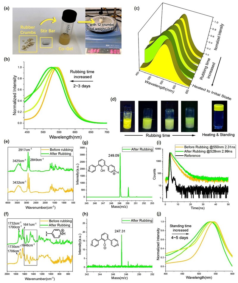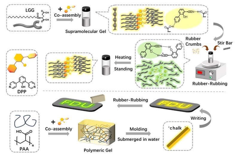 近日,复旦大学朱亮亮课题组设计构建了一种超分子功能发光凝胶,通过相应的凝胶因子和双吡啶苯酚化合物(DPP)的共组装,成功实现了选择性的橡胶摩擦刺激响应来调控凝胶的结构和发光变化。