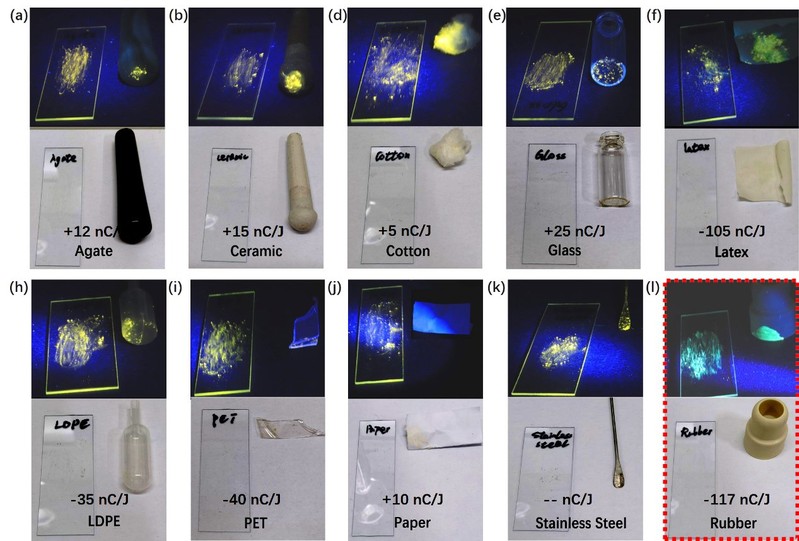 研究人员还验证了该体系对摩擦刺激响应的选择性。选择了十种不同的材料分别对凝胶进行摩擦,通过摩擦前后荧光发射的变化程度可以确定其对于橡胶摩擦的刺激最敏感。