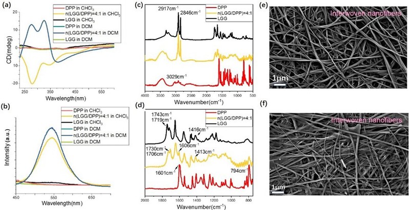 当使用小分子手性凝胶因子(L/DGG)和DPP进行共组装时,可以得到具有超分子手性的凝胶,且表现出黄色的荧光发射。还可以通过改变溶剂来调节体系超分子手性以及圆偏振荧光的方向。
